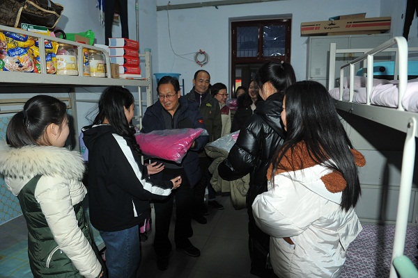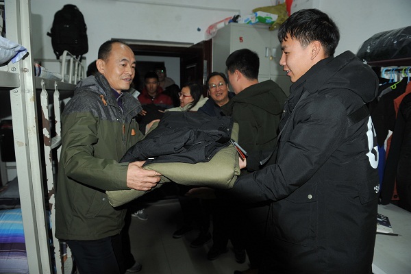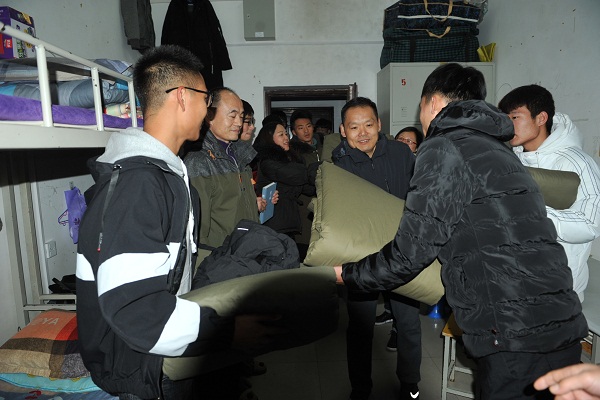 杨院长一行在校区领导陪同下到学生宿舍看望慰问同学们,为家庭困难的学生发放棉衣棉被,向贫困学生送去学院的关心与爱护。杨院长代表学院向同学们表示亲切的慰问,仔细询问了同学们的生活学习情况,并鼓励同学们要积极面对生活和学习上的困难,把暂时的困难当作学习的动力,树立自己的人生目标,珍惜当下的学习机会,刻苦学习,以优异成绩回报家庭、学院和社会。同时杨院长还表示,如果生活上遇见困难可以及时向学院反映,学院会尽力帮助家庭经济条件困难的同学完成学业。本次“关爱贫困生,寒冬送温暖”慰问活动,共为校区家庭困难新生购置棉被150套,棉服36套,用以保障困难学生安全顺利渡过寒冬,为经济困难学生送上一份冬日的温暖。