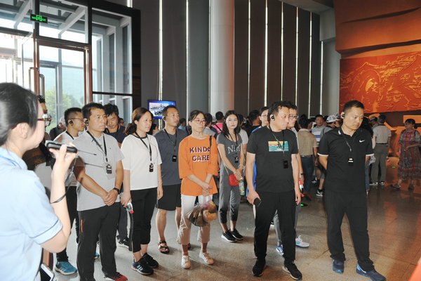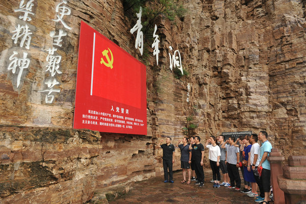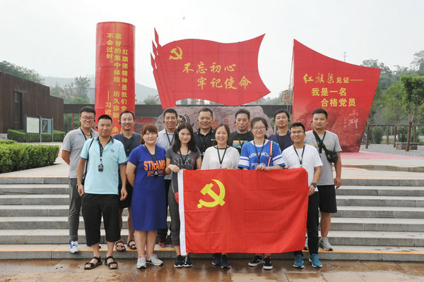 7月30日上午8:00,校区全体党员在校区领导张广明、胡玉玺、郜攀峰带领下,乘车从学院本部出发,三个小时后到达林州。首站便是红旗渠纪念馆,一幅幅画卷再现了当年林县人民在共产党领导下,自力更生,无私奉献,艰苦创业的丰功伟绩。在当年极端恶劣的自然环境下,林县人民用自己的智慧和双手,不畏艰险、不畏困难、团结合作、无私奉献,用血泪和汗水浇灌出举世闻名,被国际友人赞誉为世界第八大奇迹的人工天河——红旗渠,创造人类历史又一奇迹;第二站来到分水闸,红旗渠干渠在这里一分为三,远眺崇山峻岭之间飘来的天河,我们禁不住再一次被林县人民的愚公精神所折服;第三站是青年洞,沿着宽度不到一米的河堤走廊,经过两个多小时的跋涉,来到红旗渠开挖难度最大咽喉工程之一——青年洞,该洞总长616米,高5米,宽6.2米,如把开挖该洞的土石垒筑成高2米,宽3米的墙,可纵贯祖国南北,把广州与哈尔滨连接起来。因参加凿洞的突击队是从全县民工中抽调出来的300名优秀青年,故取名叫“青年洞”。在洞口,全体党员干部职工在校区党总支书记张广明同志带领下重温入党誓词。