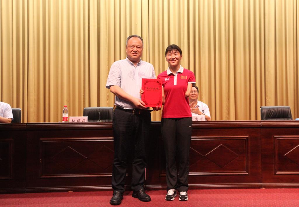 会上,杨国安院长宣读《关于授予李露同学“郑州大学体育学院杰出大学生”荣誉称号的决定》;张绍通书记为李露同学颁发荣誉证书,用以表彰李露“身残志坚 刻苦训练 为国争光 感动中原”的先进事迹。