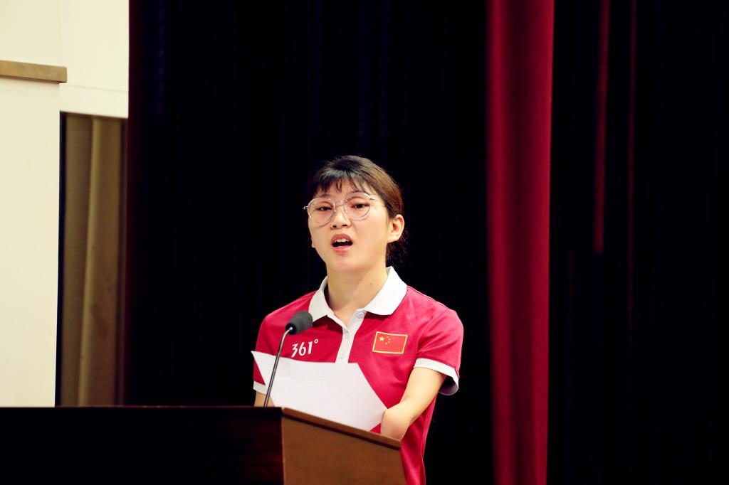 她充满感情地说:“多年的国内外征战,使我深深的感觉到,祖国的国际地位在不断攀升;我深刻意识到,没有中国共产党坚强有力的领导和祖国的繁荣强大,就不可能有个人出彩的机会和平台。在党和政府的关心下,2016年我获得“中国五四青年奖章”、“全国五一劳动奖章”、“全国三八红旗手”的荣誉称号;在母校郑大体院的支持下,我又成功入选2017感动中原十大人物。在学院的推荐下,我个人还荣获2017年“河南省五四青年奖章”和2018年“河南省三好学生”的荣誉称号。这些荣誉都是过往,在今后的生活、训练中,我会继续努力,用自己的成绩来回报祖国,回报母校,回报教练,回报家人。在今年的七一建党节,我庄重的写了一份入党申请书并递交给学院党组织,在今后的训练和生活中,我愿意以我的实际行动接受党组织的考验,以自己的实际行动积极向党组织靠拢。生活在这个新时代,我们都是幸运的,也是幸福的,作为习近平总书记提出的“两个一百年”的亲历者和见证者,我们有机会也更有理由要在这个伟大的时代里实现自己的人生价值和奋斗目标,来与祖国共奋进,与中原共出彩、与母校共发展!因为青春就是用来奋斗的!”。