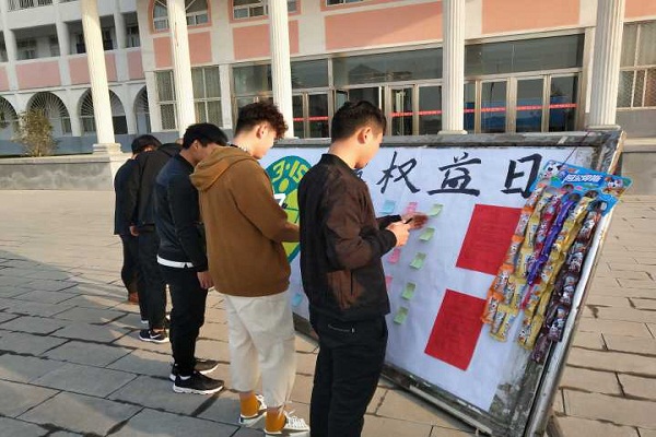 为了纪念3.15消费者权益保护日,宣传《消费者权益保护法》等法律条文及维权知识,进一步提高同学们的维权意识,3月15日上午11点,登封校区团总支在教学楼前广场举行“文明消费,理性维权”3.15普法宣传活动。