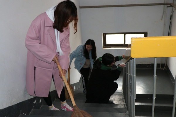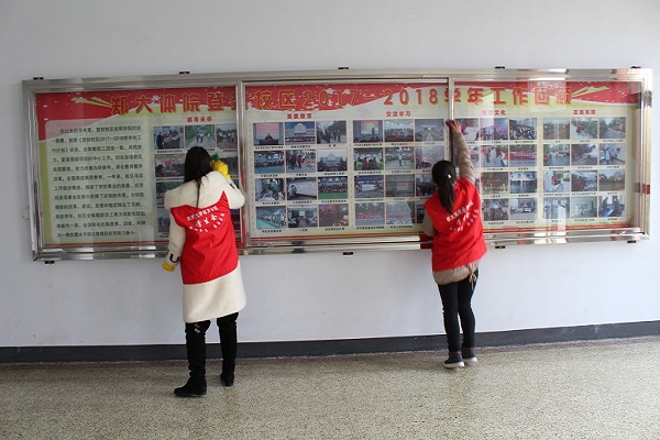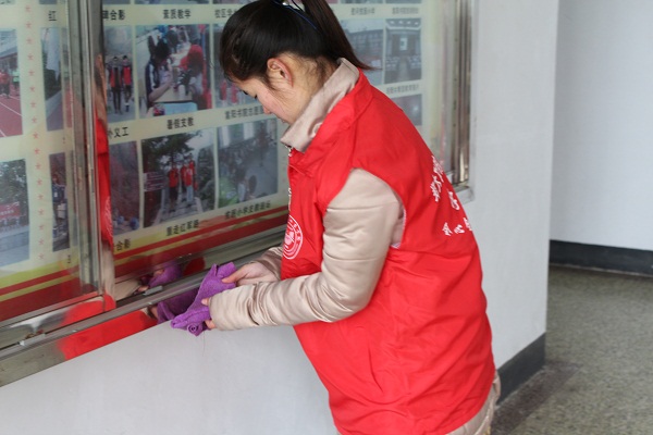 上午9点整,志愿者们准时在升旗广场前集合,同学们自带毛巾、扫帚、拖把等清洁工具,细心的擦拭校园各处宣传栏,认真清扫空地上、草坪上的垃圾。打扫完毕后,志愿者们又在校园里张贴了文明标语,提醒同学们保持校园整洁。