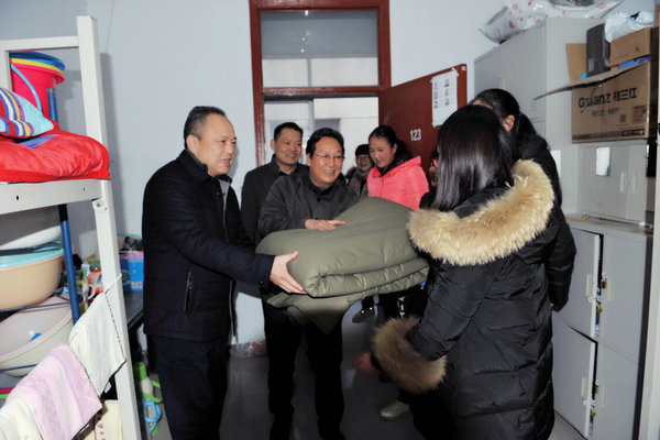 张院长一行在校区领导陪同下到学生宿舍看望慰问同学们,并为家庭困难的学生发放棉衣棉被。张院长代表学院向同学们表示亲切的慰问,勉励大家要勇于面对困难,自立自强。张院长表示,学院会尽力帮助家庭经济条件困难的同学完成学业,本次“关爱贫困生,寒冬送温暖”慰问活动,共为校区家庭困难新生购置棉被170套,棉服30套,用以保障困难学生安全顺利渡过寒冬,为经济困难学生送上一份冬日的温暖。张院长对同学们提出了三点希望:一是希望同学们奋发图强,不负众望,以乐观向上的精神敢于克服困难、勇于面对挑战;二是希望同学们勤俭节约、勤学苦练、立志成才;三是希望同学们学会感恩,知恩图报,时刻铭记父母养育之恩,老师教育之恩,他人的关爱之恩,努力使自己成为一名诚实守信、身心健康的优秀青年。