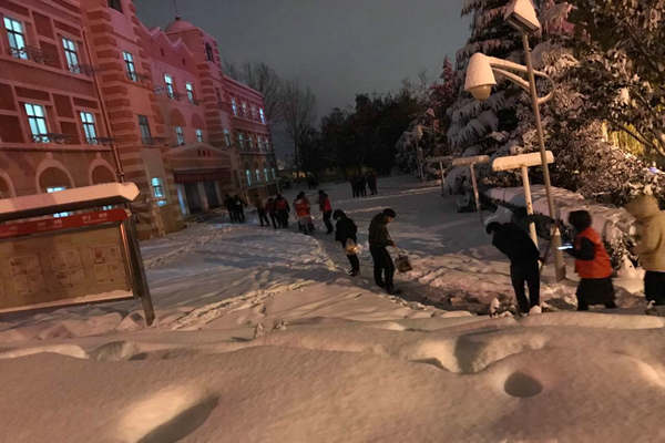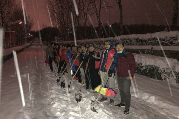 为了确保师生出行安全,登封校区学生会按时间组织了三次清雪活动。上午11点,学生会二十多干部冒着纷飞的大雪在教学楼食堂入口等同学们必经处的楼梯上铺设纸板等防滑用具,在初落成的雪地上开辟道路。不断降落的雪花和低至零下的气温使除雪,铺路工作更加艰难,但这些并没有影响他们的工作热情。中午,大雪纷飞,学生会的干部依然在飞扬饿大雪中清扫“人行道”,铁锨挥动,簸箕篼落,不宽不窄的“人行道”已清扫完成。大雪渐渐加大,鹅毛般的雪覆盖住了人行小道。厚度约为30厘米的积雪层中,依稀可见清扫好的人行小道。晚上8点左右,雪终于停了,学生会成员今日的最后一项工作也要开始了,铲雪清路。经过共计3个小时的清扫,校区内通行状况得到改善,扫雪任务圆满完成。