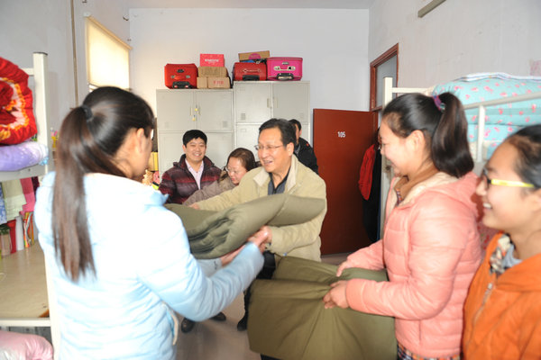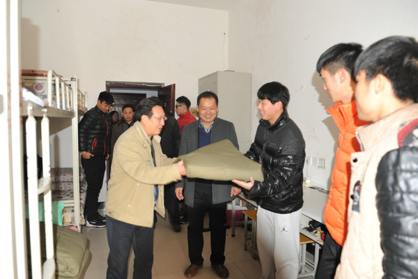 杨院长一行在校区领导陪同下到学生宿舍看望慰问同学们,并为家庭困难的学生发放棉被。杨院长代表学院向家庭困难的学生表达了学院领导的亲切问候和关怀。叮嘱同学们一是要以乐观向上的精神风貌迎接挑战,做到不惧困难、自立自强;二是希望同学们勤俭节约、勤学苦练,立志成才、;三是希望同学们学会感恩,知恩图报,时刻铭记父母养育之恩,老师教育之恩,他人的关爱之恩,努力使自己成为一名诚实守信、身心健康的优秀青年大学生。