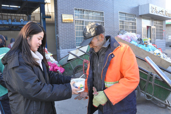 来自我校的35名志愿者无疑是此次爱心活动的主力军。同学们一早就来到嵩阳大酒店,他们有的擀面皮、有的包饺子,大家都忙的不亦乐乎,虽然4点多就起床很辛苦,但同学们却都乐在其中,热气腾腾的的饺子出锅后同学们又忙着和酒店的工作人员为环卫叔叔、阿姨们送饺子。环卫工人叔叔、阿姨每天很辛苦,舍小家为大家,每天天不亮就来清洁我们的每条街道,今天冬至了,他们也不能和家人一起吃碗热饺子,还要坚守在岗位上,今天我们的志愿者和社会的众多爱心人士一起为他们送去温暖,在寒风中辛苦工作的环卫工叔叔、阿姨们,一脸惊喜地看着送饺子的同学们并连声道谢,几位阿姨都眼含热泪的接过了一碗热乎乎的饺子。