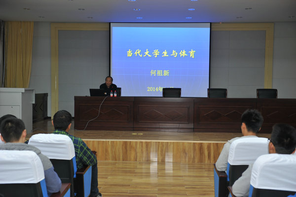 何教授的讲座题目为《体育与当代大学生》,他从体育与大学生的关系切入,深入浅出的论述了奥运精神对当代大学生的影响和作用,从对邓亚萍、姚明、林丹等世界著名运动员的成长历程说明体育对培养青年大学生顽强拼搏精神,坚强意志,公平、公正,公开精神,团结和谐精神原则的作用,进而论证体育对大学生的健身功能、教育功能、娱乐功能、政治功能等方面作用。何教授还就体育专业大学生如何在大学四年学习规划自己的学习生活谈了自己的感受和看法,并对同学们的大学生活提出了建议和要求。最后他希望同学们政治上进步,思想上先进,学习山优异,争做中国有特色社会主义事业的合格接班人。何教授的讲课受到了同学们的热烈欢迎和满堂喝彩。