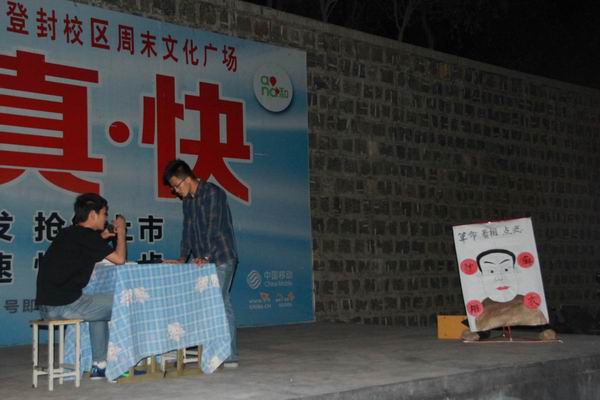 2014年5月11日晚8点,校区周末文化广场举办了一场丰富多彩的文艺活动。此次活动内容由流行歌曲和幽默舞台剧组成。其中刘哲同学演唱的《空白》引得阵阵掌声喝彩,由英语班和旅管班带来的情景剧妙趣横生。压轴“重头戏”《屌丝男士》则令现场观众捧腹大笑引得好评如潮。此次活动既丰富了同学们的学习生活,也丰富了多彩的郑体校园文化。