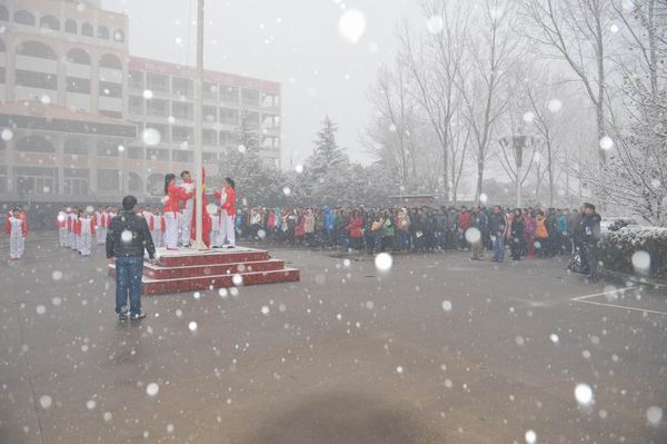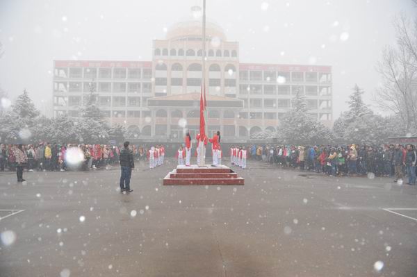 2月17日上午8:00点整,登封校区全体师生举行新学期首次升旗仪式。尽管寒风刺骨,大雪纷飞,七点五十五分整,满怀热枕、激情和信心的师生分成两个方队整齐排列,指挥员一声令下,升旗仪式正式开始,威武的国旗队迈着铿锵的步伐来到国旗台前,全场肃静,国歌响起,随着旗手的手臂一挥,鲜艳的五星红旗在雄壮的国歌声中冉冉升起。