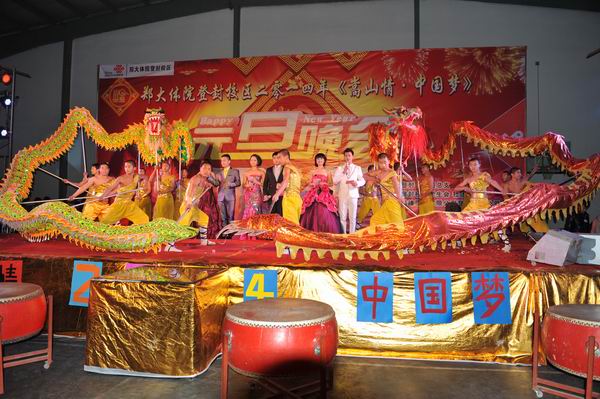 2013年12月30日晚上6:30,登封校区团总支组织承办的2014年《嵩山情 中国梦》元旦晚会在喜庆欢乐的舞龙舞狮表演中拉开序幕,登封校区领导班子、全体师生一千多人出席了晚会。晚会分为四个部分,第一部分“依依嵩山情”,第二部分“拳拳郑体心”,第三部分“悠悠赤之魂”,第四部分“泱泱中国梦”,共18个节目,历时近2个小时。