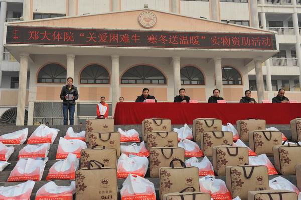 刘院长在活动仪式上发表讲话时指出,为了保障家庭经济困难的学生安全顺利渡过寒冬,学院拿出专款为登封校区197名家庭经济困难的学生购置了棉衣、棉被,带来的不仅仅是实物的资助,更带来了院领导的关爱和希望。刘院长对同学们提出三点希望:一是希望同学们奋发图强,不负众望,以乐观向上的精神风貌敢于克服困难、勇于面对挑战;二是希望同学们勤俭节约、勤学苦练、立志成才;三是希望同学们学会感恩,知恩图报,时刻铭记父母养育之恩,老师教育之恩,他人的关爱之恩,努力使自己成为一名诚实守信、身心健康的优秀青年。杨院长宣读了郑体院〔2013〕76号《关于对我院家庭经济困难学生进行实物资助的决定》。