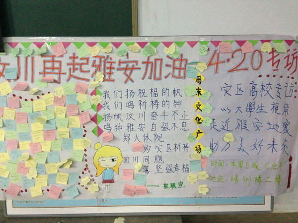 正值“5.12”地震五周年之际,登封校区第二期周末文化广场活动拉开帷幕。本期关于地震的专题活动主题为“以大学生视角,走近雅安地震,助力美好未来”。