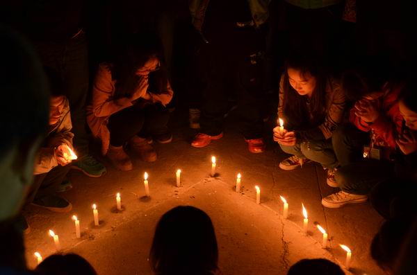 我们为逝者哀悼,为灾区祈福!在校区同学们的微博、微信、QQ上,大家纷纷表示对雅安的关注。同时,在21日晚校园周末文化广场活动开幕晚会上,特意安排了为雅安祈福仪式。在主持人念完介绍词后,全体人员默哀一分钟。之后大家一起高呼:“雅安加油!中国加油!”
