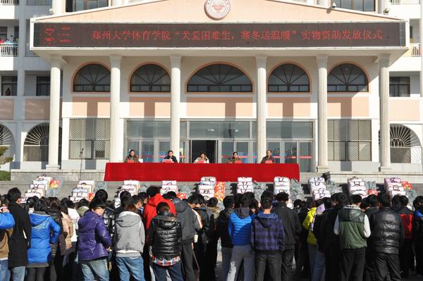巫院长在活动仪式上发表讲话时指出,为了保障家庭经济困难的学生安全顺利渡过寒冬,学院拿出专款为登封校区140名家庭经济困难的学生购置了棉衣、棉被,还有院本部大四毕业学生捐赠的衣服、被子、书籍等物品,带来的不仅仅是实物的资助,更带来了院领导和学长们的关爱和希望。最后,巫院长对同学们提出三点希望:一是希望同学们奋发图强,不负众望,以乐观向上的精神风貌敢于克服困难、勇于面对挑战;二是希望同学们勤俭节约、勤学苦练、立志成才;三是希望同学们学会感恩,知恩图报,时刻铭记父母养育之恩,老师教育之恩,他人的关爱之恩,努力使自己成为一名诚实守信、身心健康的优秀青年。