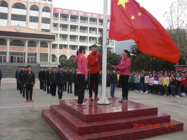 清晨,我院登封校区全体师生举行2012-2013年新学期首次升旗仪式。七点四十分,教学楼前的升旗广场上各班级在国旗台前站成整齐的队伍等待升旗仪式的到来。伴随校园铃声的响起,升旗仪式正式开始。迎着朝阳,新生国旗护卫队成员迈着铿锵的步伐来到国旗台,全场肃静。国歌响起,升旗手振臂一挥,鲜艳的五星红旗徐徐展开,在雄壮的国歌声中冉冉升起,全体师生行注目礼。仪式之后,各班学生有序退场。