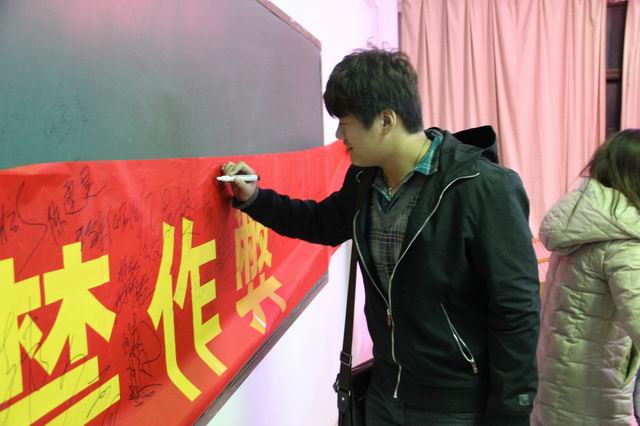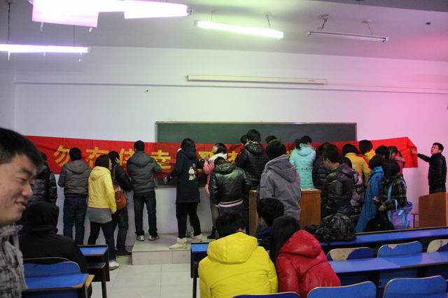 2012年1月3日晚,校区2011级民传三、四班全体同学在教学楼二楼第七教室召开班会,举行“诚信考试”签名仪式,大家纷纷在“勿存侥幸、严禁作弊”的横幅上签署自己的名字,以此证明将认真应考、诚信应考、坦然应考,共同为登封校区共建端正考风、严肃考纪的良好校风贡献力量。
