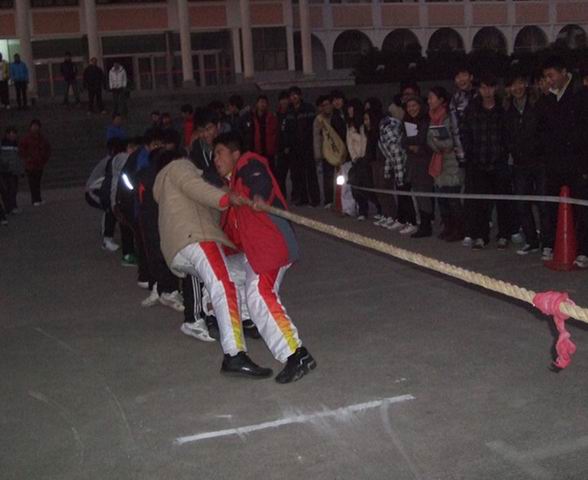 2011年12月13-16日,校区团总支组织的2011年“凝心聚力”班级拔河比赛每天下午5:20准时开始在升旗广场进行。这次拔河比赛采用单淘汰制,按要求每班选派15名男生参加,目的是为了营造良好的校园文化氛围,增进班级之间、同学之间的交流,增强班级体的凝聚力。活动经过三天的角逐,最终2011级田径一班获得第一名,民传三班获得第二名,民传二班和民传一班获得第三名。