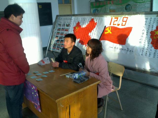 2011年12月7日,校区团总支组织学生会举行了纪念“一二•九”知识问答活动。同学们踊跃参加,本次问答活动所选题目集知识性、趣味性贯穿活动之中,,使校区同学深刻感受到了“一二•九”运动精神的的内涵。