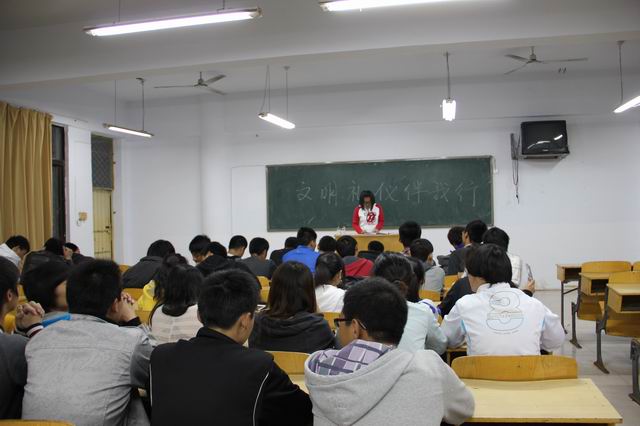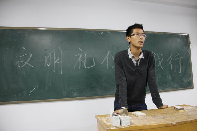 2011年10月20日晚,登封校区2011级民传四班在教学楼第十一教室召开“文明礼仪伴我行”主题班会,团支书刘轶鹏主持班会。会上,班长杨浩针对“在宿舍抽烟”、“随手扔垃圾”等校内不文明现象先做发言,引导大家从多方面思考当代在校大学生应当遵守的文明礼仪,随后,副班长刘昕阳列举校内文明礼仪事例,文体委员周程林根据四班同学主修的跆拳道专项特点着重讲解跆拳道礼仪,学习委员成龙讲述关于学习生活方面的礼仪事项,生活委员评讲宿舍卫生相关事宜。总之,在班委的引导下,班会顺利进行,同学们也踊跃发言,纷纷畅谈自己的看法。