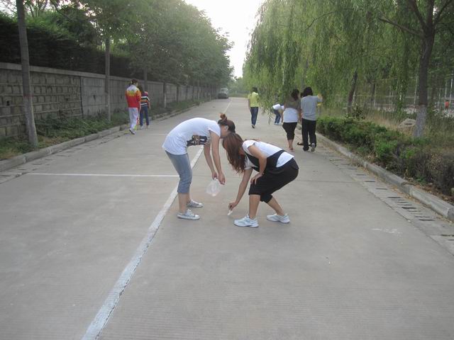 6点20分左右,同学们各自找来清洁袋,在主干道汇合,经过简单分组后,便迎着朝阳,沿着主干道开始了对主干道及两侧草坪上的垃圾的清除工作。大家不怕脏,不怕累,频频弯腰,用手捡起所到之处的垃圾,并放入清洁袋,经过近一个小时热火朝天的奋战,对主干道进行了地毯式的清扫。