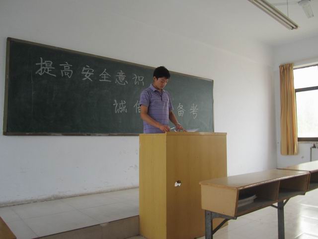 期末考试将至,为严肃考试纪律,进一步加强学风建设,提高同学们在校及假期期间的安全意识。2011年6月12日6:30,2010级民传二班在三楼十二教室召开了主题为“提高安全意识,诚信文明备考”的班会,班干部结合会议主题,为同学们特别强调了本次班会的重要意义。