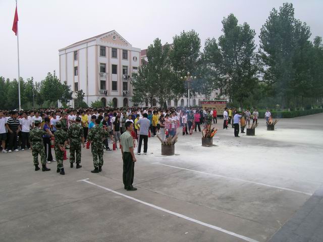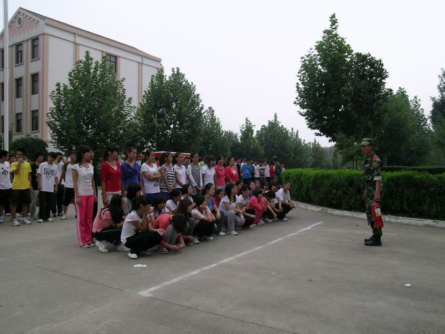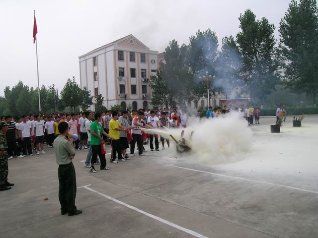 下午三点,登封校区邀请登封市公安消防大队消防宣传员、演练专家到校区升旗广场为全体新生做关于“如何加强防火意识和遇到火灾应当如何处理”的专题讲座。在随后进行的演练活动中,演练专家现场讲解示范干粉灭火器的使用方法,并指挥部分学生当场练习使用灭火器扑灭点燃的火堆。最后,全体学生按军训方队在教官的带领下,徒手练习掌握干粉灭火器的使用方法。