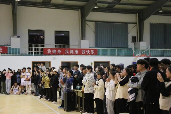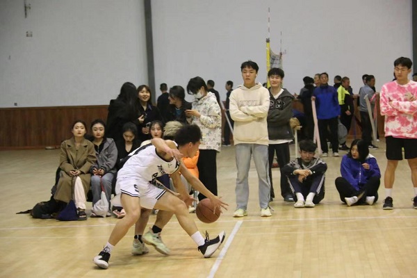进攻防守,你来我往。比赛高潮迭起,比分交错上升。一次次拼抢,一次次跃起,一次次跌倒又重新站起,场上的球员们热血澎湃,场下的观众们呐喊助威。体院学子的青春气息,点燃了整个篮球场。