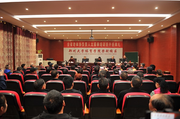 11月19日上午,由河南省老体协主办,河南省老体协太极拳专项委员会、郑州大学体育学院承办的2019年河南省老体协负责同志太极拳培训班在我院登封校区开班,河南省老体协副主席王书义,河南省老体协副秘书长、省老体协太极拳专项委员会副主任魏来周,中国老体协太极拳专项委员会副主任兼秘书长周备锋,我院院党委书记、中国老体协太极拳专项委员会副主任张绍通出席开班仪式并致欢迎辞。中国老体协会太极拳专项委会副秘书长常全旺主持开班典礼。此次培训为期5天,共有来自全省18个地市、省直管县的75名老体协负责同志参加。