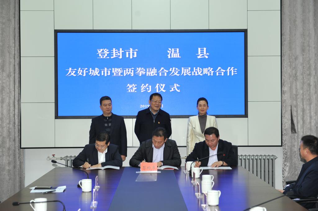 为了进一步贯彻落实河南省委省政府提出的关于加快“两拳”、“两山”融合发展的理念和精神,郑州大学体育学院、登封市教体局、温县太极拳武术文化管理中心,三方遵循“友好合作、优势互补、资源共享、共谋发展”的原则,签订了两拳融合发展战略合作协议。三方约定各自依托现有资源, 实现资源、信息、人才的共享,互派优秀裁判员、教练员、运动员交流学习;在体育赛事、营销、培训、旅游及品牌拓展等领域实现深度友好合作, 加速“两拳”(少林拳、太极拳)融合发展,打造世界级中国功夫交流示范区,持续扩大中国武术文化的国际影响力。