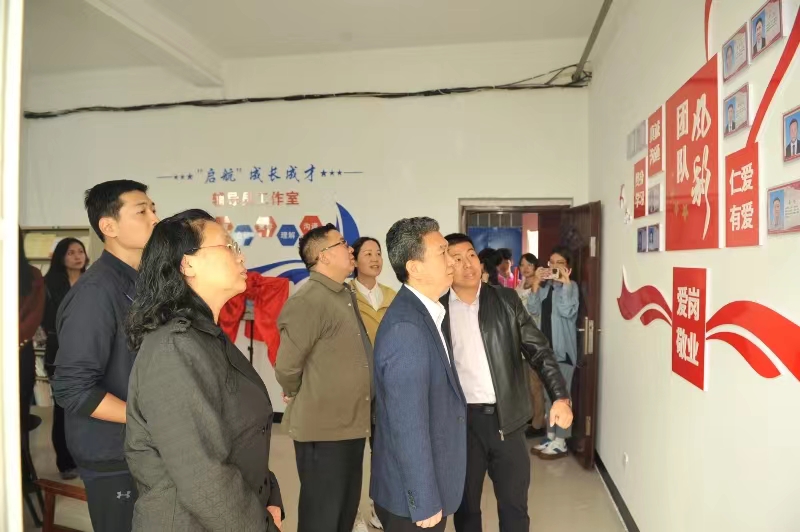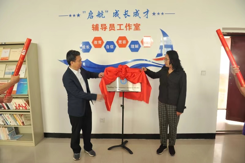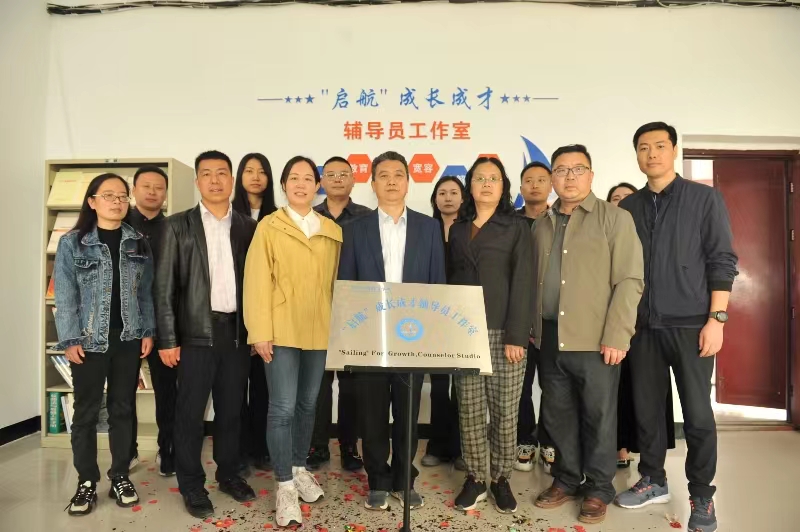 仪式中,朱晓东老师作为工作室主持人引导各位领导和师生们对工作室进行参观,并对团队风采、职责分工、党建引领、主题展示等一一做了讲解,对工作室的目标任务、发展思路、预期成果等做了详细汇报。随后,刘书记和祖处长共同为“启航”成长成才辅导员工作室进行揭牌。