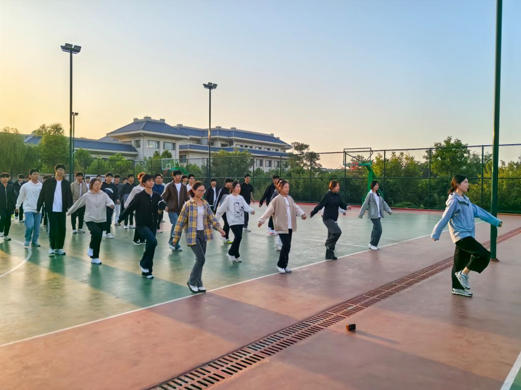 天刚刚微亮,在辅导员老师的组织下,校区全体学生早晨6点30分在各个场地有序集合,随着口号声响起,以班级为单位,各班同学都以饱满的热情投入到早操健身活动中。队列整齐,步伐矫健,充分展现了当代大学生朝气蓬勃的青春活力。在集体跑步热身后,各个班级根据专业特点采取不同的活动形式分散进行训练。