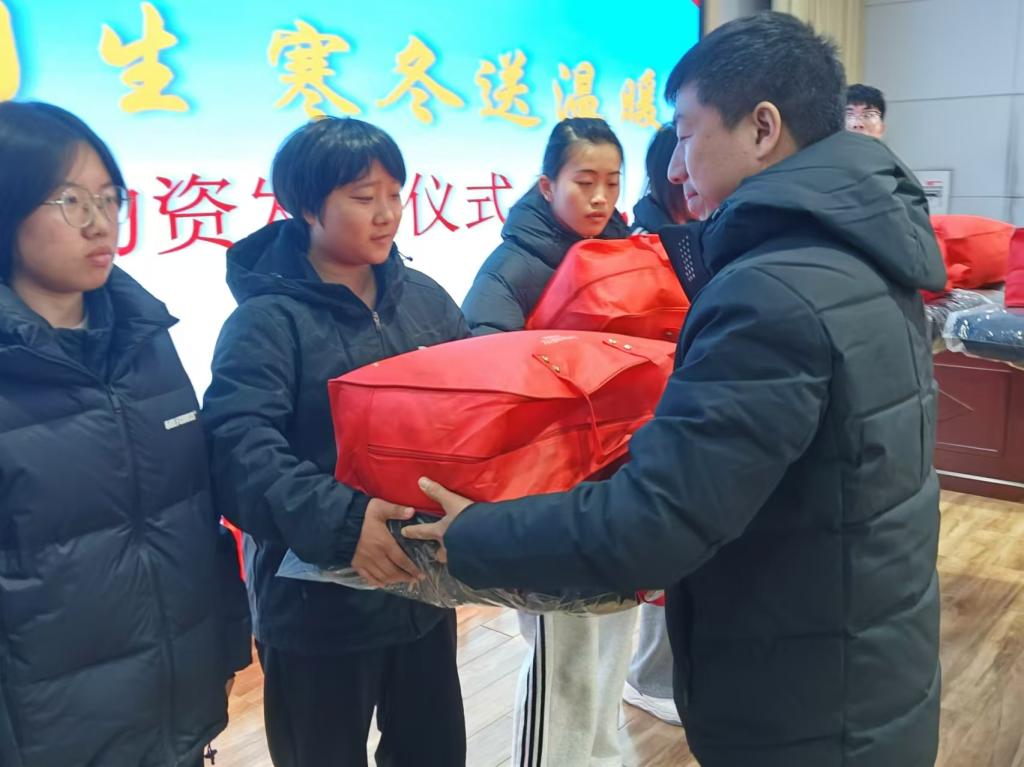 仪式的最后,朱晓东书记为受助学生代表们发放爱心物资,这些物资承载着学校的关爱与温暖,为困难学生的日常学习和生活提供了保障。