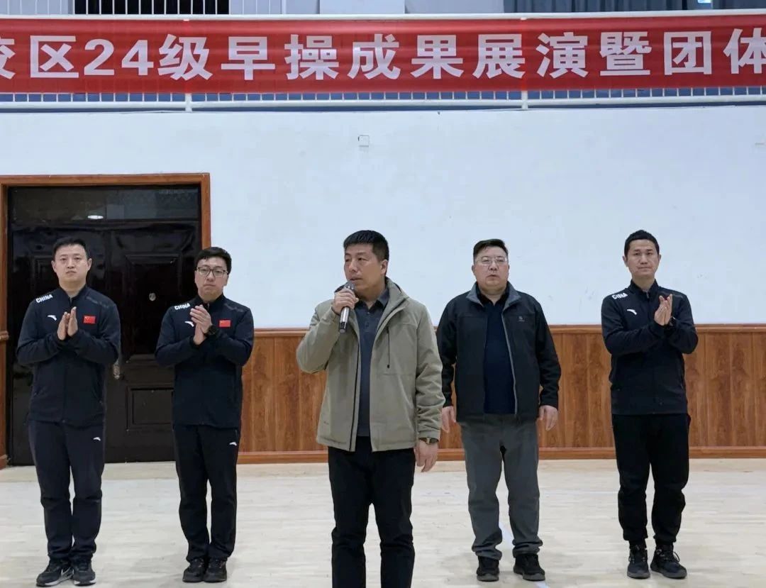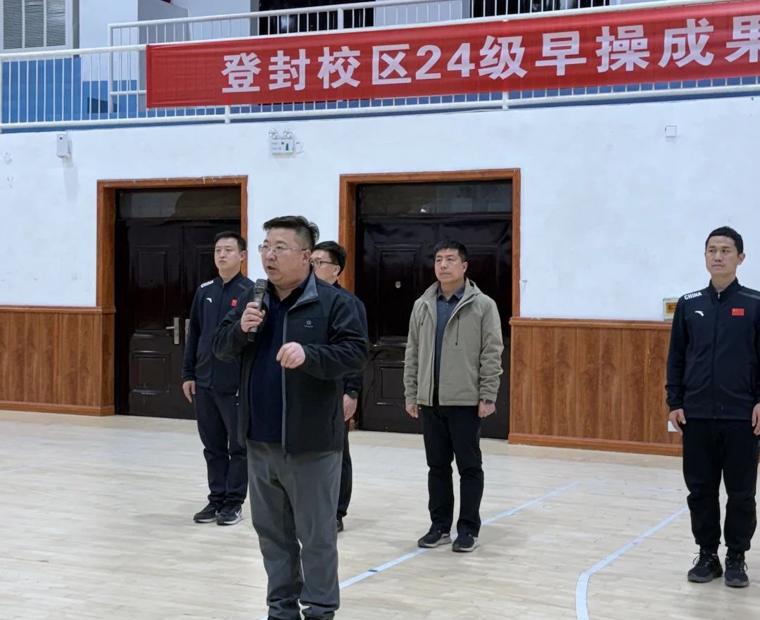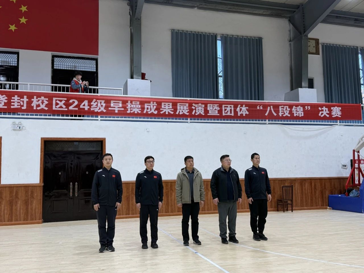 为推进素质教育,促进学生身心健康,增强集体荣誉感,3月20日,登封校区举办了早操成果展演暨团体“八段锦”决赛,登封校区党总支书记朱晓东、校区主任李远伟、团总支书记于安然、河南体育学院武术与民族传统体育系武术套路教研室主任陈钢、武术套路教研室武术教师徐潇、院太极拳队教练王卫绍以及全体辅导员老师参与了此次活动。