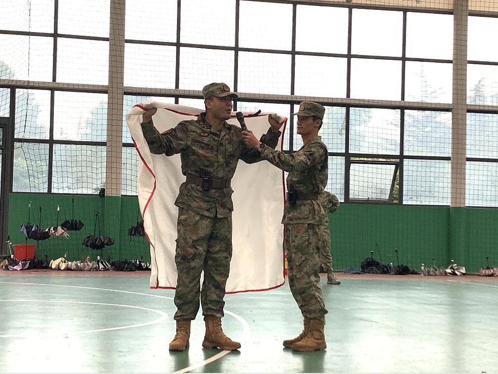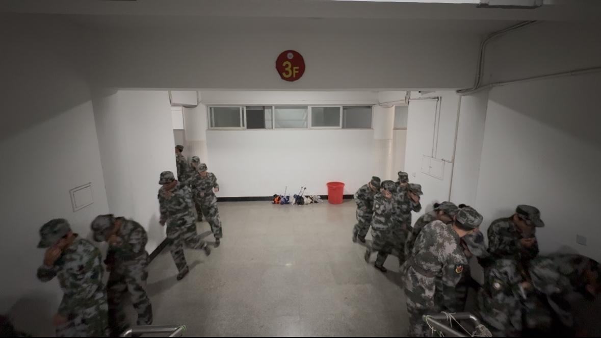 宿舍区突发警报,新生在教官与工作人员指挥下,用湿毛巾捂口鼻、躬身低姿,沿预定路线快速撤离至指定安全区域,整个过程有序高效,达到预期疏散目标,实现“教育一个学生、影响一个家庭、带动整个社会”的辐射效应。