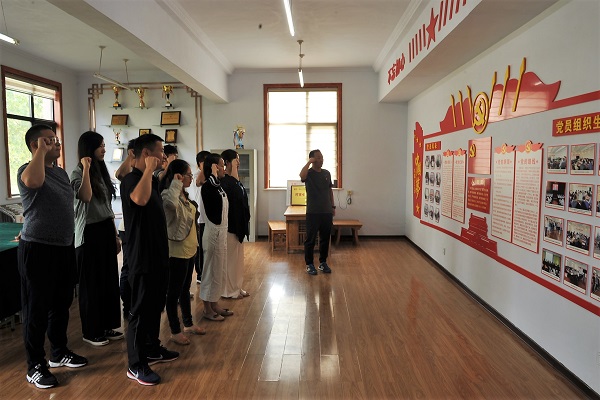 校区教职工支部书记刘志强带领全体教职工党员面对鲜红的党旗,重温入党誓词,铭记党的奋斗历史,回顾入党时的崇高理想和奋斗目标,不忘初心,牢记使命。随后,校区教师党员在校区第一会议室观看了《初心永恒》和《时代楷模张玉滚》电影。