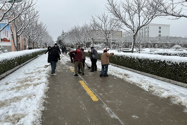 银装素裹兆丰年,冰雪的到来固然展现了不同以往的校区风光,但道路上的积雪也给学生上课带来了不便。为了保障师生们出行安全,登封校区师生拿起扫帚和铲子顶着寒风,团结协作清扫校园道路上的积雪,铁铲与冰雪的撞击声演奏成了一首首劳动赞歌,师生们劳动的身影更是校园里一道靓丽的风景线。在大家的共同努力下,校区大门口和校园内各主干道上的积雪被清扫干净,开辟出一条条干净畅通的道路。
