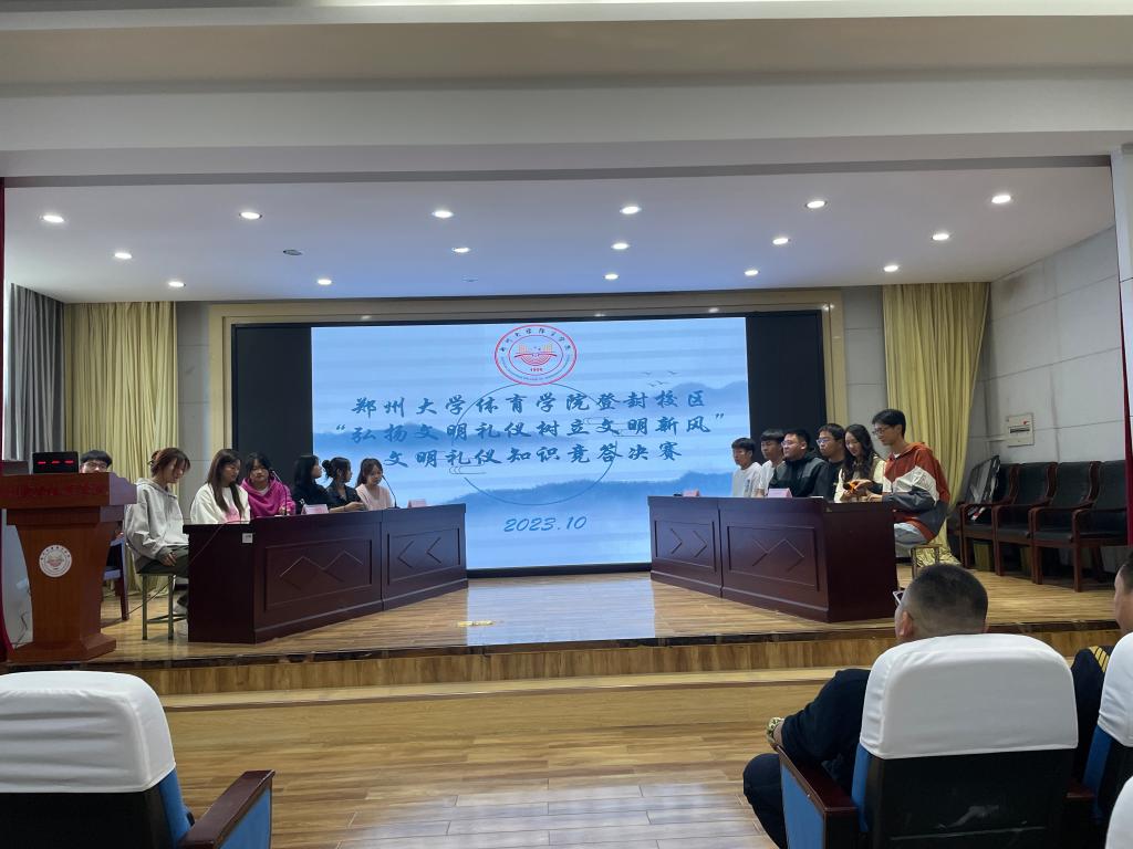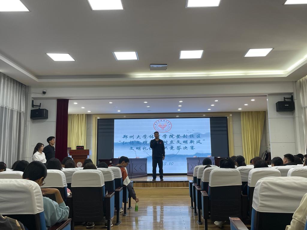 为增强学生的文明礼仪意识,营造积极向上、文明和谐的校园文化环境,10月25日,郑州大学体育学院登封校区在阶梯教室举行了“弘扬文明礼仪 树立文明新风”文明礼仪知识竞答决赛。登封校区党总支副书记朱晓东,登封校区团总支书记于安然,校区全体辅导员以及200余名学生参加了本次活动。