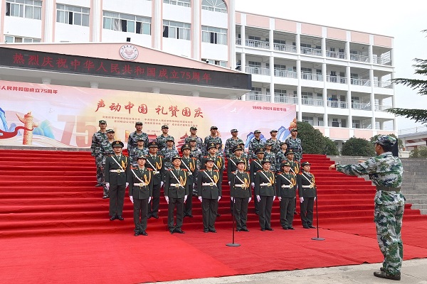 紧接着,校区国旗护卫队迈着矫健的步伐走上台前,共同演唱歌曲《强军战歌》。歌声激昂有力,每一个音符都仿佛在诉说着对祖国的忠诚和热爱。