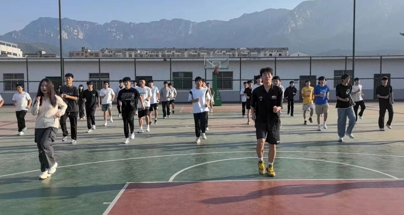 早晨,社体二班在操场排列整齐。美好的一天,从跳健美操开始。大家动作整齐有力,脸上满是笑容,充满活力地跳跃、伸展、扭转,大家都很投入,随着节奏尽情舞动,操场充满了蓬勃的朝气。