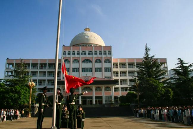初夏的校园,宁静、庄重、热烈。在升旗广场,师生队伍整齐肃立,国旗护卫队员身姿挺拔步伐整齐。国歌奏响之际,旗手精准挥动,五星红旗在初升的阳光中舒展飘扬。