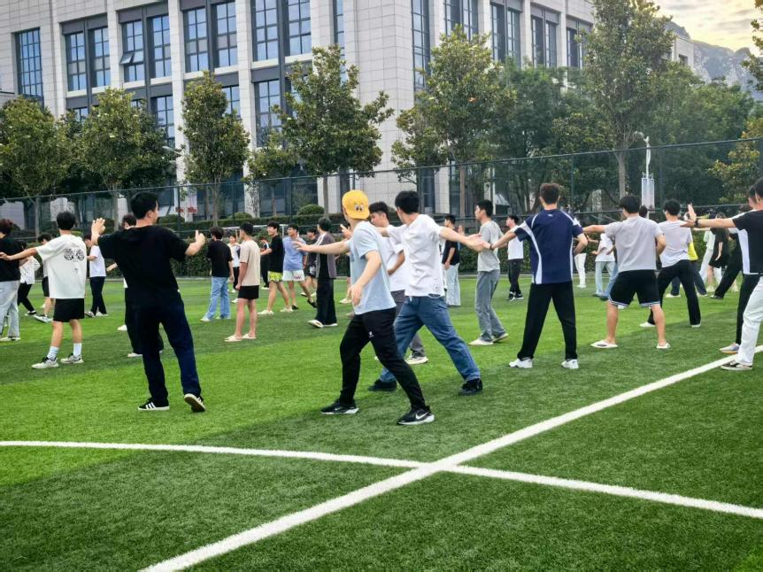 在清晨练习太极拳早操,周围环境相对安静,在全身心投入太极拳的动作和呼吸中,可以暂时忘却生活和学习中的压力。