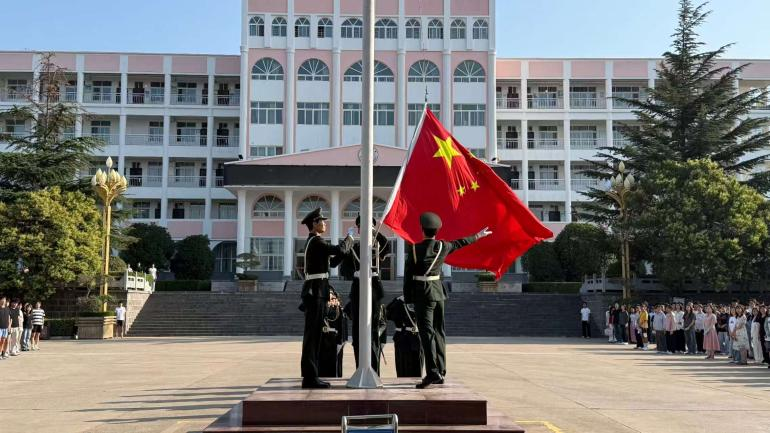 晨光穿透枝叶间隙,洒下斑驳光影。伴随着铿锵有力的脚步声,国旗护卫队踏着整齐划一的正步,目光坚定地向我们走来。师生们目光紧紧追随,眼神滚烫,庄重行礼。